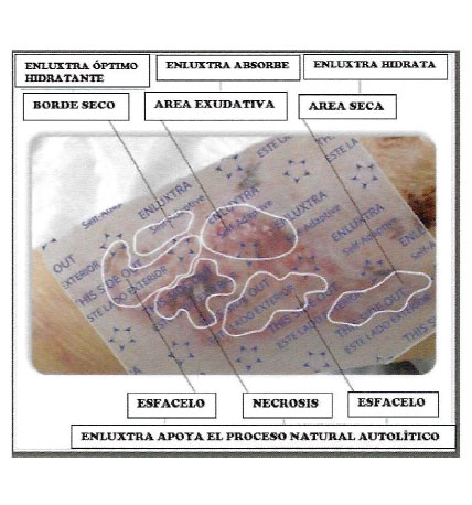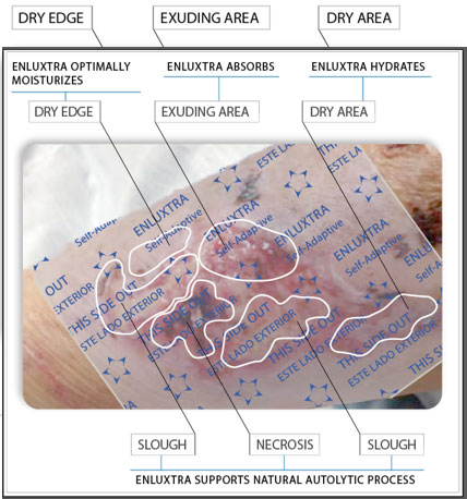 - Además, la limpieza continua de heridas, respaldada por un entorno de curación húmedo sostenible y la capacidad de Enluxtra para evacuar los productos del desbridamiento autolítico natural, ayuda a reducir rápidamente la inflamación y acelerar el proceso de cicatrización de heridas.